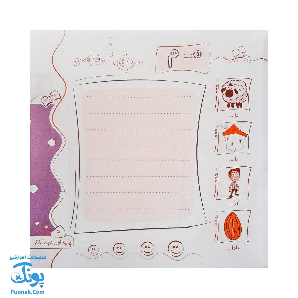 در هر صفحه متناسب با درس مورد نظر (نشانه) نقاشی هایی آورده شده تا دانش آموز با رنگ آمیزی آن ها نیز لذت ببرد.